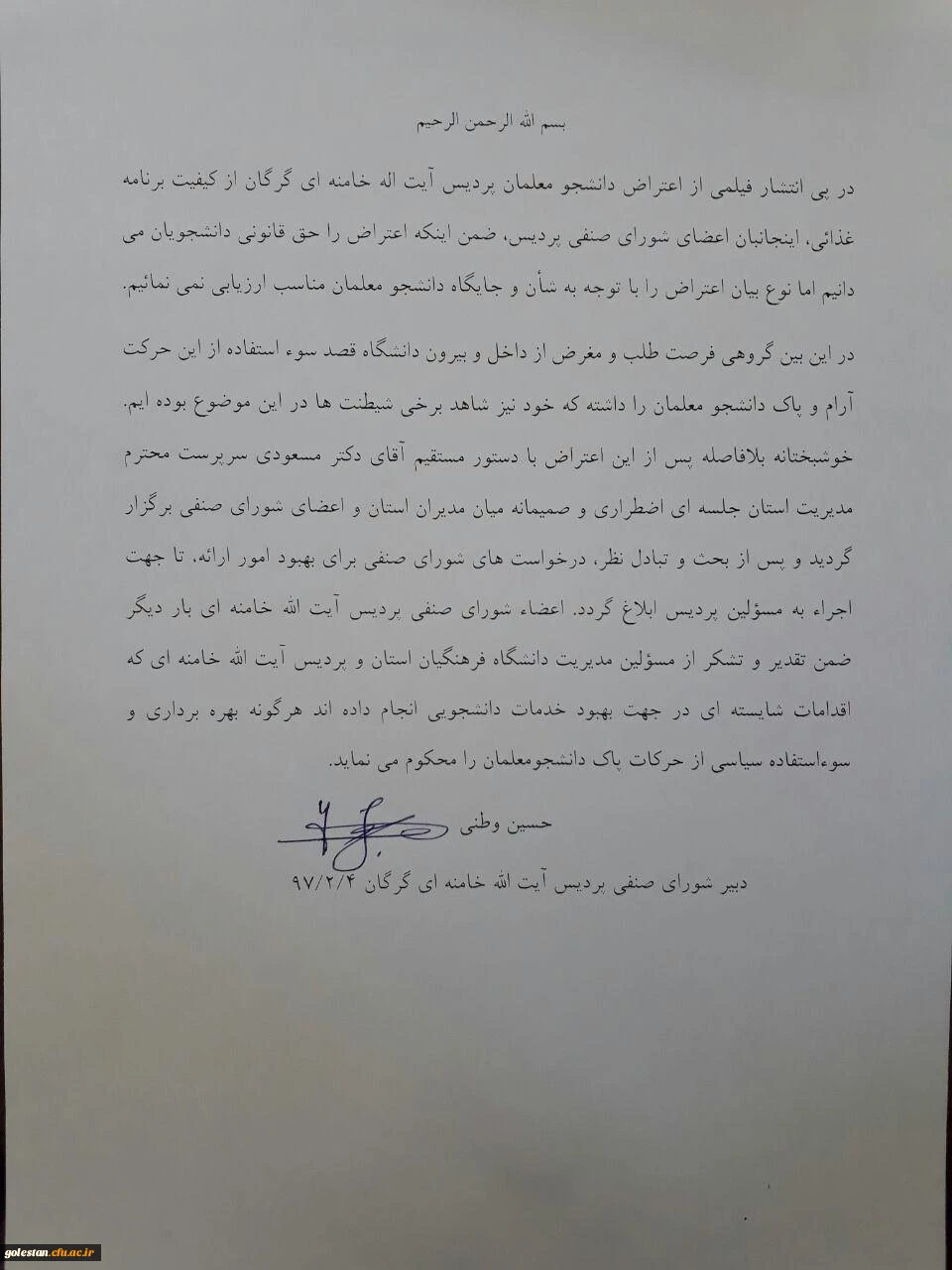 محکومیت حرکت نسنجیده چند نفر از دانشجویان توسط دبیر شورای صنفی پردیس ایت الله خامنه ای گرگان 2