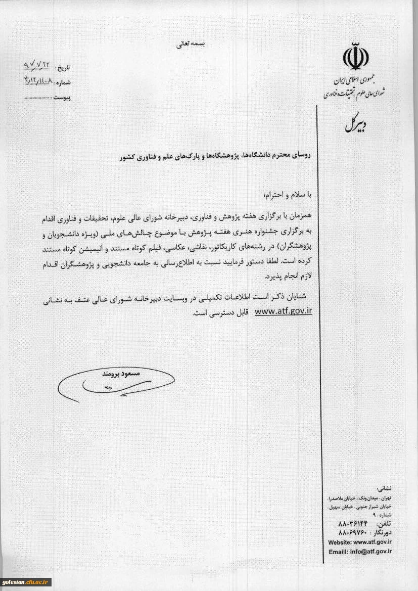 قابل توجه اعضای هیأت علمی و دانشجومعلمان فراخوان جشنواره هنری هفته پژوهش با موضوع چالش های ملی برگزار می گردد. 2