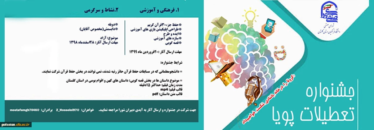 امتیاز دهید : برگزاری جشنواره غیر حضوری تعطیلات پویا در راستای شیوع ویروس کرونا 2 چهارشنبه 21 اسفند 1398 ساعت 14:18