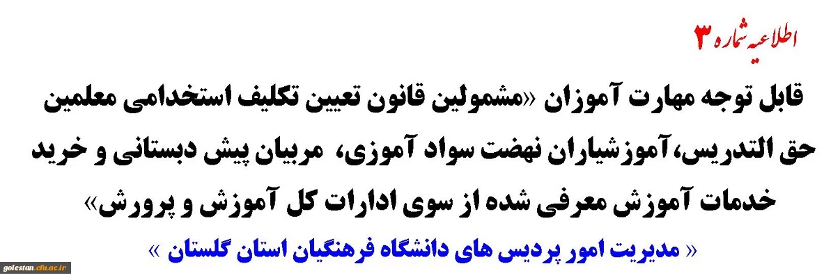 قابل توجه مهارت آموزان «مشمولین قانون تعیین تکلیف استخدامی معلمین حق التدریس،آموزشیاران نهضت سواد آموزی، مربیان پیش دبستانی و خرید خدمات آموزش معرفی شده از سوی ادارات کل آموزش و پرورش» 3