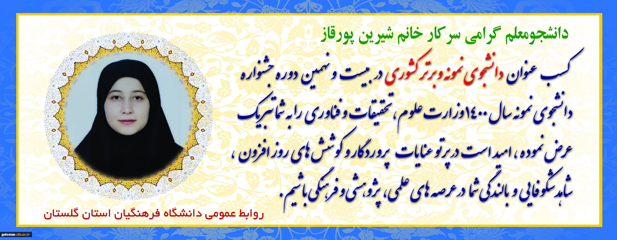 امتیاز دهید : انتخاب دانشجومعلم گلستانی به عنوان دانشجوی نمونه کشوری 2 سهشنبه 23 فروردین 1401 ساعت 9:38