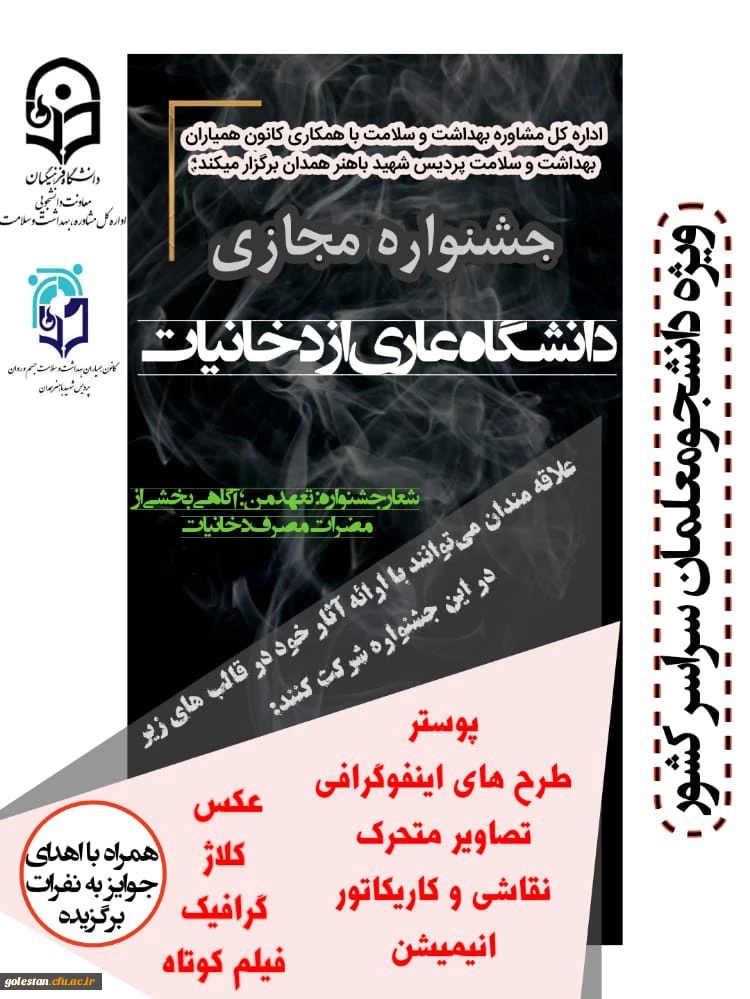 امتیاز دهید : فراخوان جشنواره دانشگاه بدون دخانیات ویژه دانشجو معلمان سراسر کشور. 2 یکشنبه 22 خرداد 1401 ساعت 10:55
