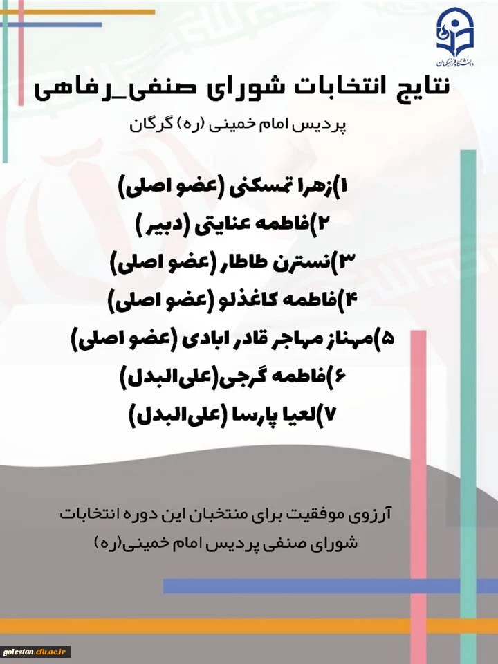 امتیاز دهید : اعلام نتایج انتخابات شورای صنفی - رفاهی پردیس امام خمینی(ره) گرگان 2 دوشنبه 23 خرداد 1401 ساعت 8:02
