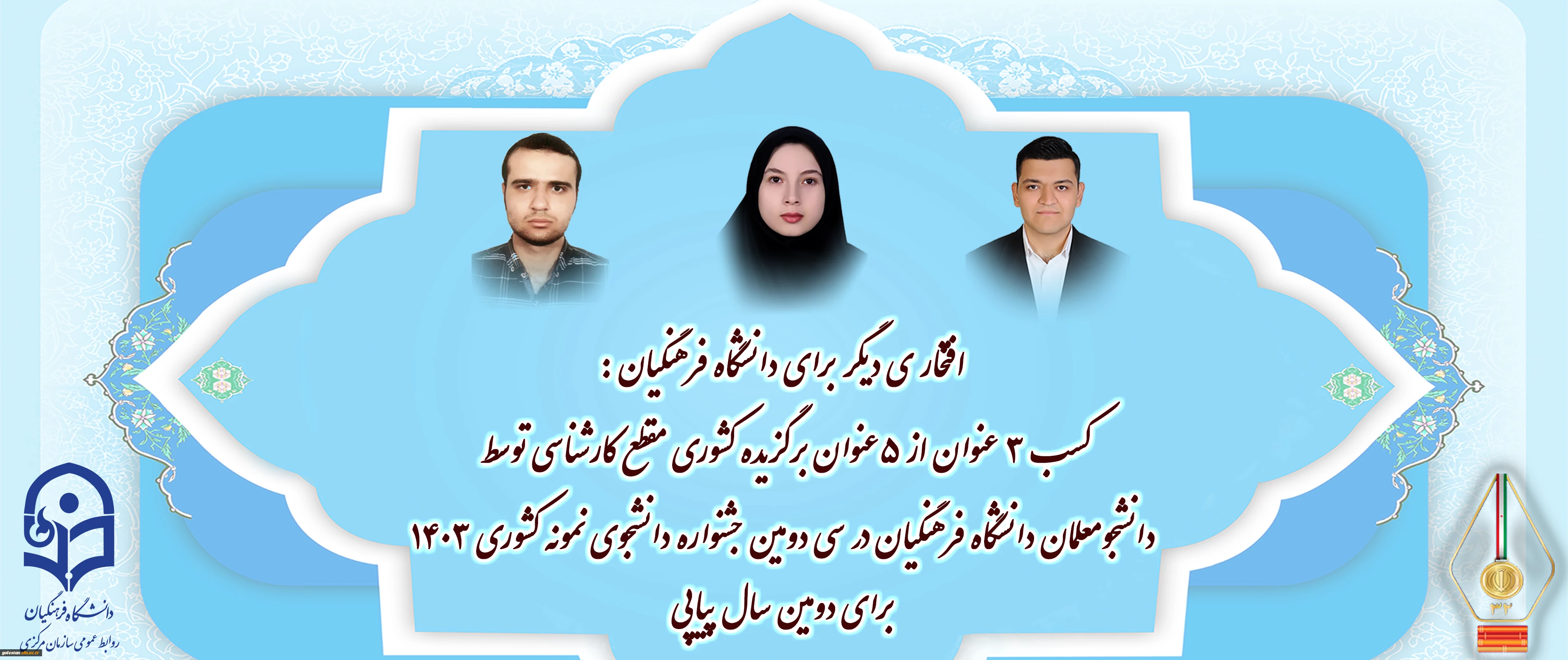 کسب ۳ عنوان از ۵ عنوان برگزیده کشوری مقطع کارشناسی توسط دانشجو معلمان دانشگاه فرهنگیان در سی و دومین جشنواره دانشجوی نمونه کشوری ۱۴۰۳ برای دومین سال پیاپی 2